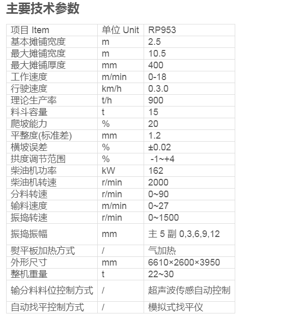 RP953型多功能攤鋪機(jī)是3系列大型攤鋪機(jī)中重要的機(jī)型之一,具有可靠的品質(zhì),超強(qiáng)的施工能力,優(yōu)異的工作性能和較高的性價(jià)比,是一種可廣發(fā)應(yīng)用于高速公路基礎(chǔ)和各種等級(jí)公路面層材料攤鋪?zhàn)鳂I(yè)的施工設(shè)備。該機(jī)采用全液壓驅(qū)動(dòng),微電腦控制,作業(yè)獨(dú)立驅(qū)動(dòng),超聲波料位傳感控制,電子自動(dòng)找平,雙振搗壓實(shí)等當(dāng)今世界最先進(jìn)技術(shù),使得該機(jī)具有作業(yè)能力強(qiáng),攤鋪穩(wěn)定性好,供料均勻,預(yù)壓密實(shí)高度,路面平整度好,操作簡(jiǎn)單舒適,維修方便快捷等優(yōu)點(diǎn)。