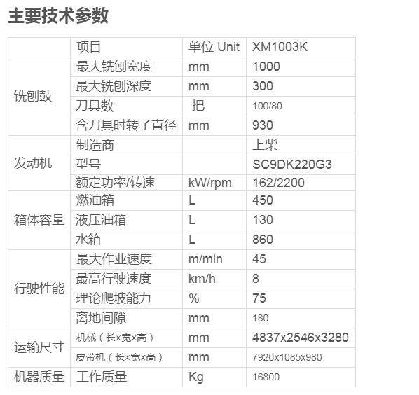 XM1003K是一款具有高性能的一米銑刨機(jī),主要用于公路、城鎮(zhèn)道路、機(jī)場(chǎng)、貨場(chǎng)、停車場(chǎng)等瀝青混凝土面層的開挖翻新。可以高效低清除路面癰包、油浪、網(wǎng)紋、車轍等;亦可開挖路面坑槽及溝槽;還可用于水泥路面的拉毛及面層錯(cuò)臺(tái)的銑平。該設(shè)備工作效率高,施工工藝劍達(dá),銑刨深度易于控制,操作方便靈活,機(jī)動(dòng)性能好,銑刨的舊料能直接回收利用,可廣泛地用于瀝青路面的維修翻新養(yǎng)護(hù)施工之中。